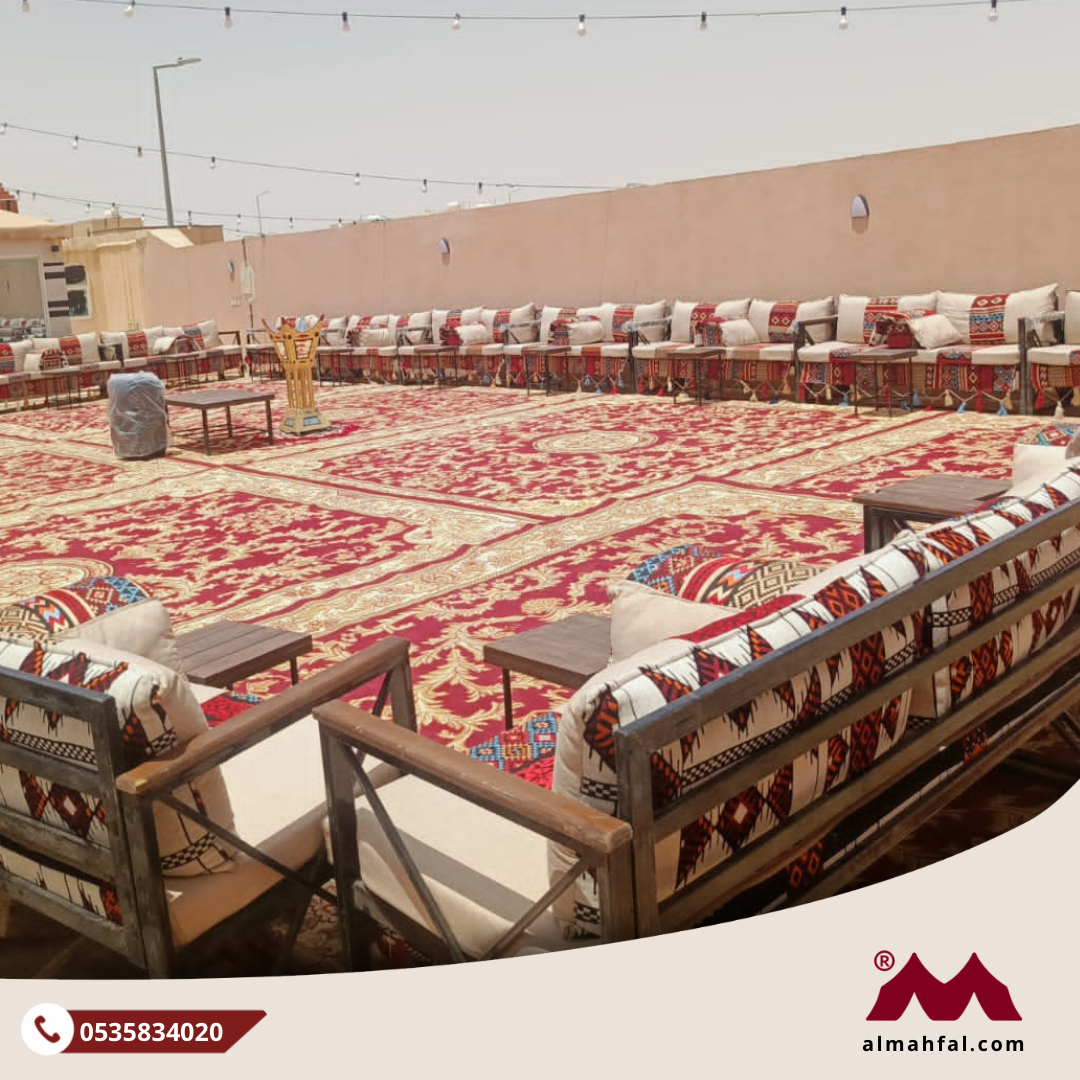 جلسة مركاز متكاملة، تشمل الفرش والمنقل، مهيأة للجلوس المريح ومناسبة للتجمعات والفعاليات.