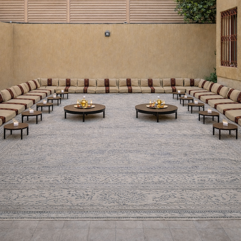 جلسة أرضية شاملة التجهيز، مناسبة للتجمعات حتى 51 شخص. تشمل الفرش، الطاولات، الإضاءة، الديكورات، المنقل، الرواق، البروجكتر والسماعة. أي عدد يتجاوز السعة يتم احتسابه على الباقة التالية مباشرة.